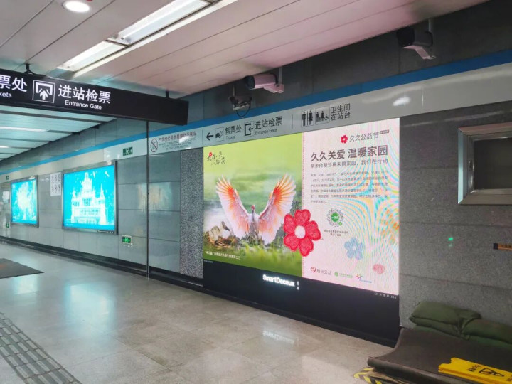 上海地铁8号线大世界站电子屏幕展示“湿地守护计划”项目内容