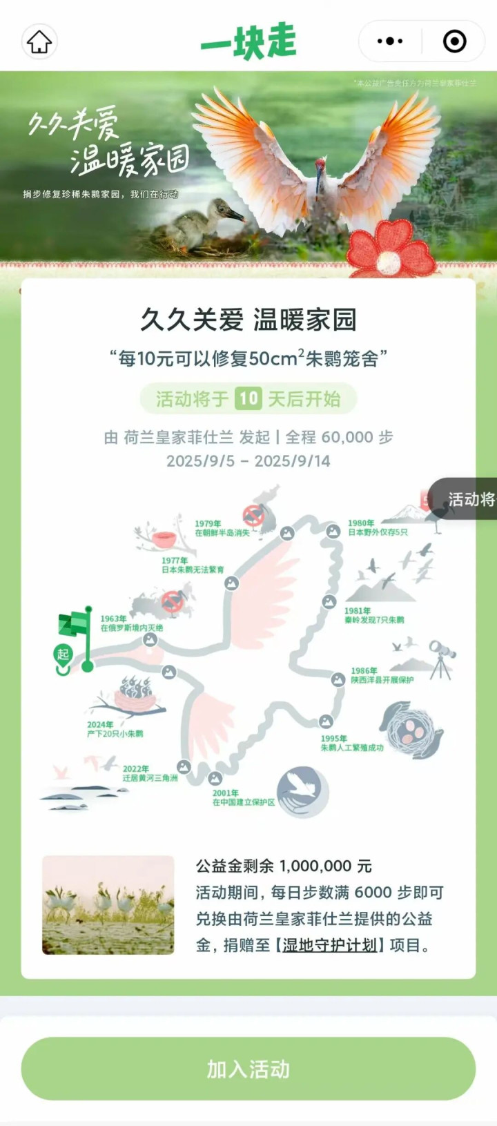 9月5日至9月9日,正值腾讯公益发起的“久久公益节”温暖启幕。中国绿化基金会与荷兰皇家菲仕兰再度携手,于9月5日正式启动“久久关爱 温暖家园”一块走公益活动。此次活动聚焦山东黄河三角洲国家级自然保护区朱鹮栖息地修复,通过“一块走”捐步、公益倡导与自然教育,凝聚广泛群众之力守护生物多样性,书写人与自然和谐共生的绿色篇章。